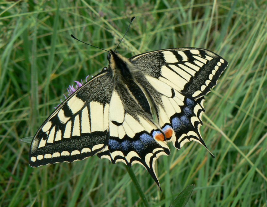 Le Machaon (Papilio machaon) : très beau papillon de la famille des Papilionidés, avec deux générations volante par an dans notre région. Les chenilles se développent sur les feuilles de la plante nourricière (ombellifères). Elle est donc régulièrement visible sur les rangées de carottes et de fenouil dans nos jardins ; à condition de ne pas utiliser d’insecticides !